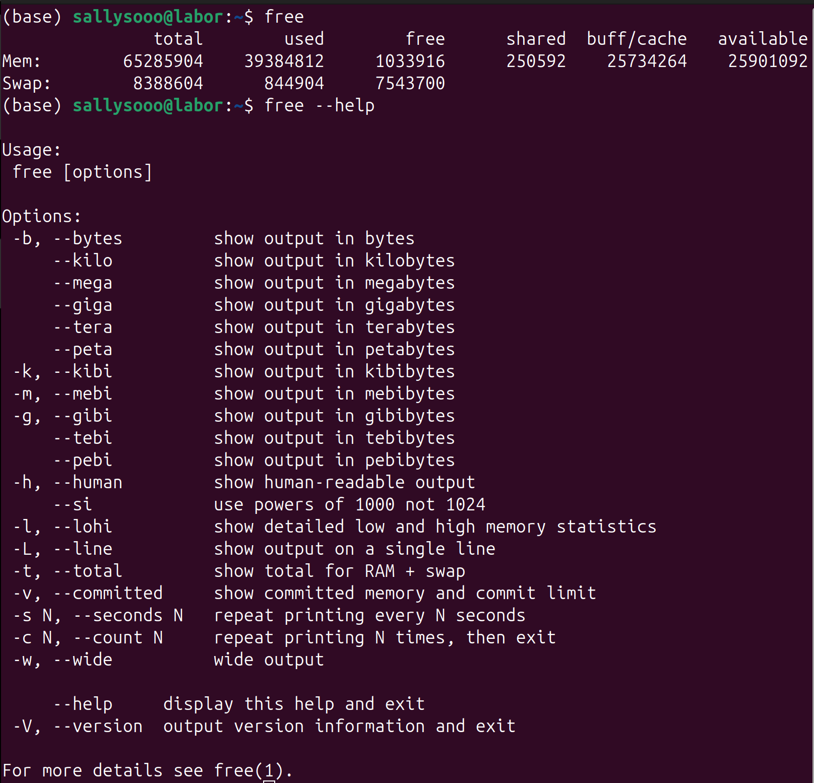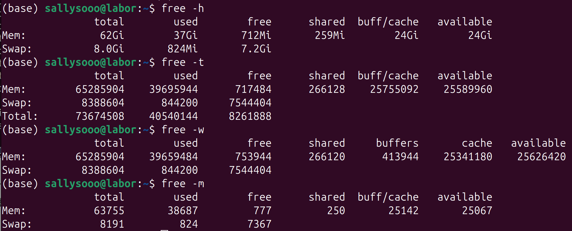 각종 옵션들을 조합해서 다음과 같이 원하는 형태로 출력할 수 있고, 필자는 주로 free -h 가 읽기 편해서 자주 사용한다!
