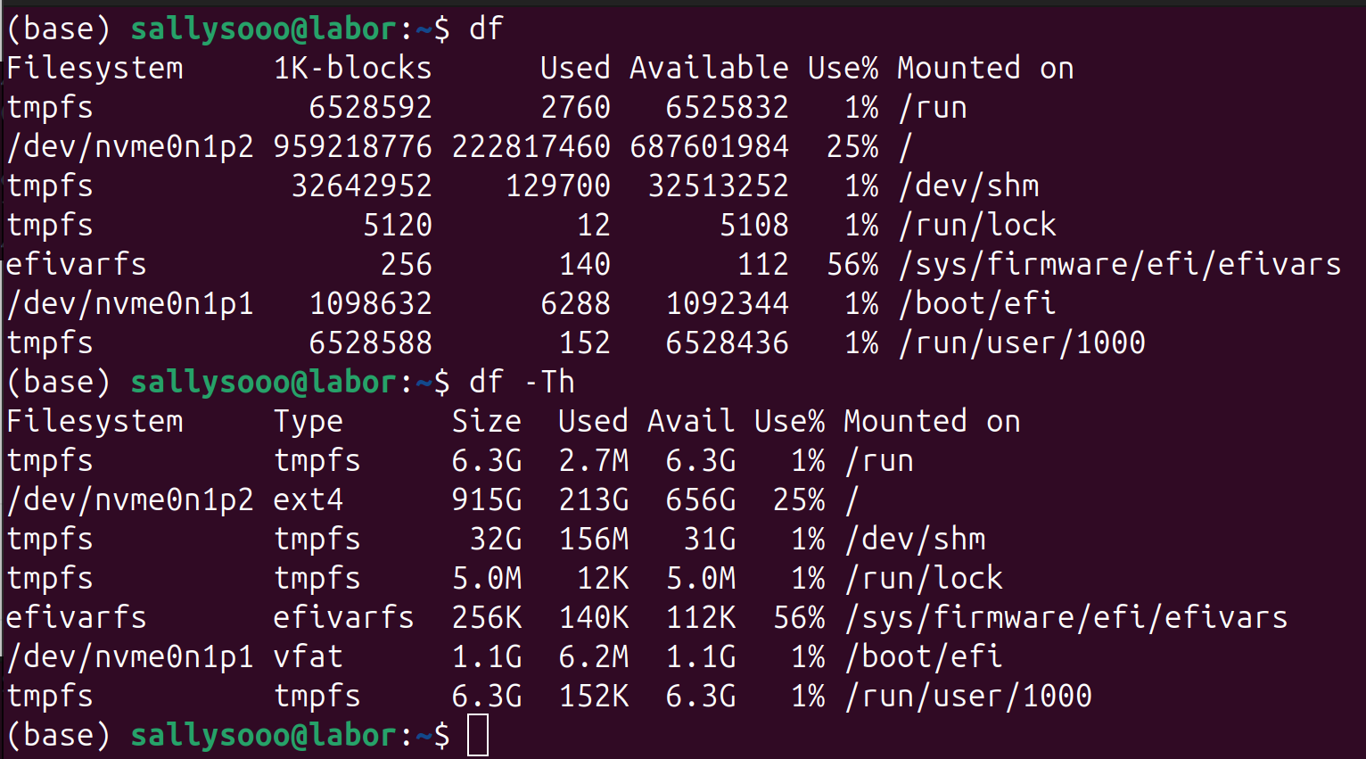 df로 확인할 수 있으며 필자는 읽기 쉽게 주로 -Th option과 함께 사용하는 편이다.