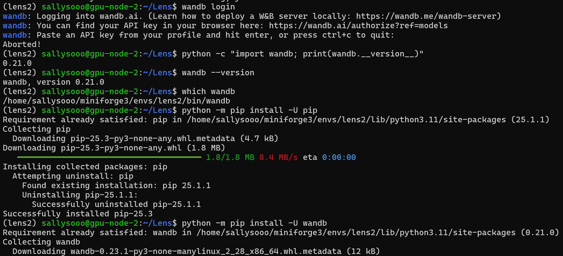 위 작업을 통해 pip와 wandb의 버전을 확인하고 다시 업그레이드 시켜주고,