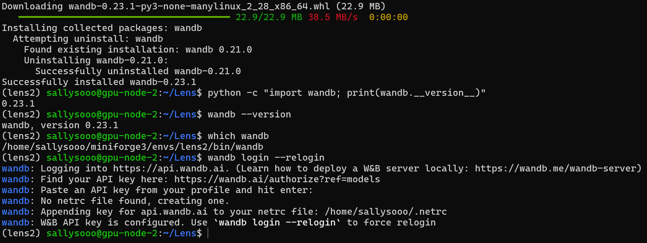 업그레이드 한 후 wandb login --relogin을 통해 다시 로그인 하여 사이트에서 복사한 api key를 입력해주면 위와 같이 이제는 잘 통과되어 로그인에 성공한 것을 볼 수 있다!
