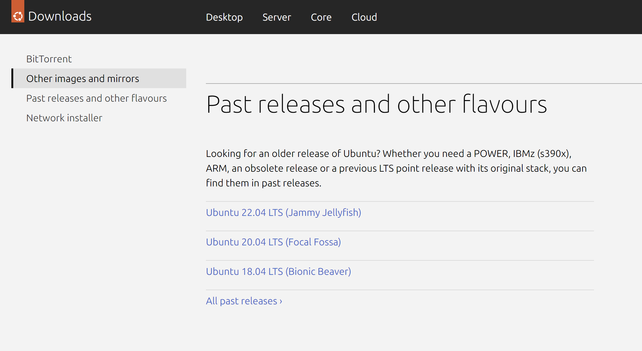 이렇게 past releases 부분이 나오는데, 여기서 자신이 원하는 구버전의 우분투를 클릭하여 다운로드하러 진입할 수 있다.