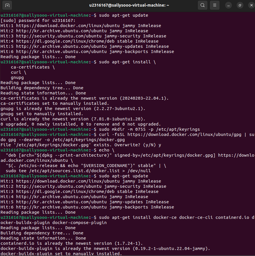 아래 명령을 순서대로 실행하여 도커 엔진을 설치한다. (환경 : 우분투 22.04)
