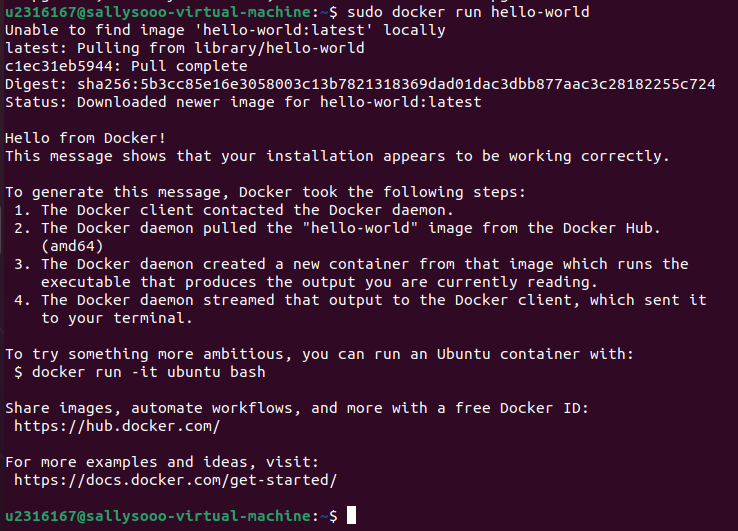 아래 명령을 입력했을 때 사진과 같이 Hello from Docker ! 가 출력되면 도커 엔진이 정상적으로 설치된 것이다.