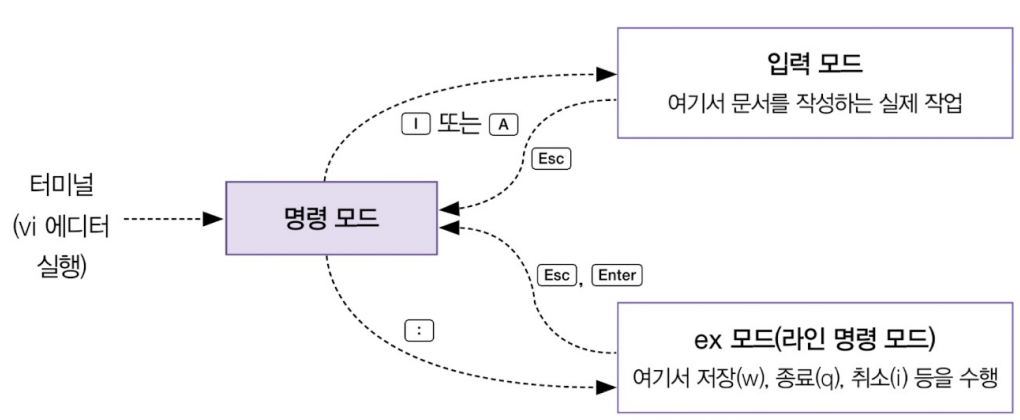 - 입력 모드에서 esc를 누르면 명령 모드로 복귀함 (명령 모드로 전환하는 기호는 : )