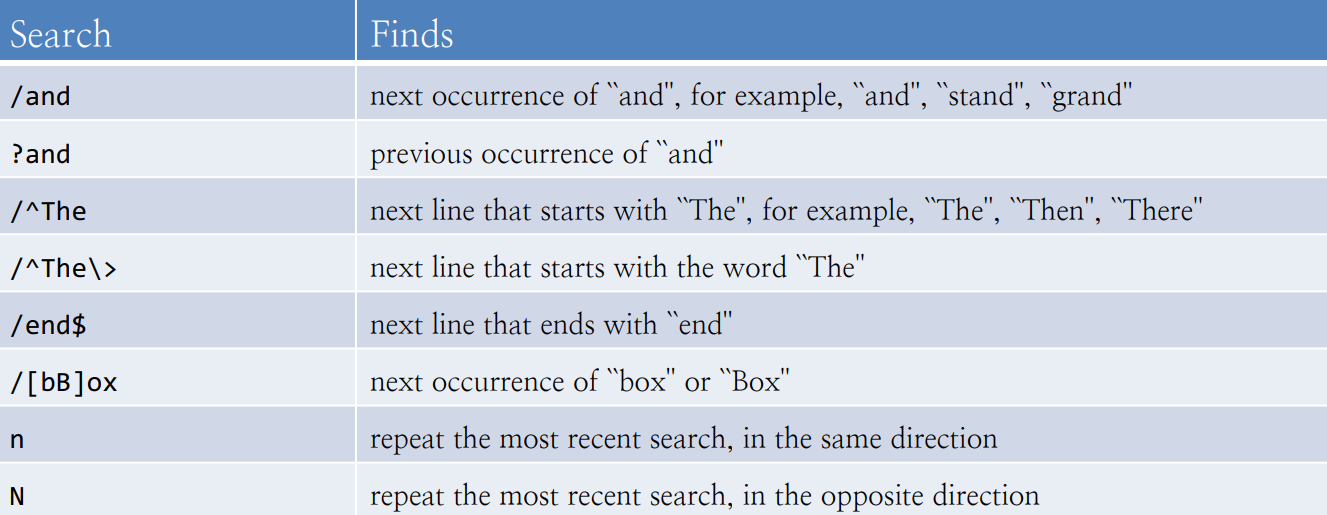 - 첫 번째 행처럼 /and 를 입력하면 현재 커서 위치 이후에 나타나는 and라는 문자열을 찾아 and, stanf, grand 등이 검색됨