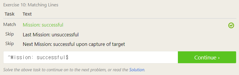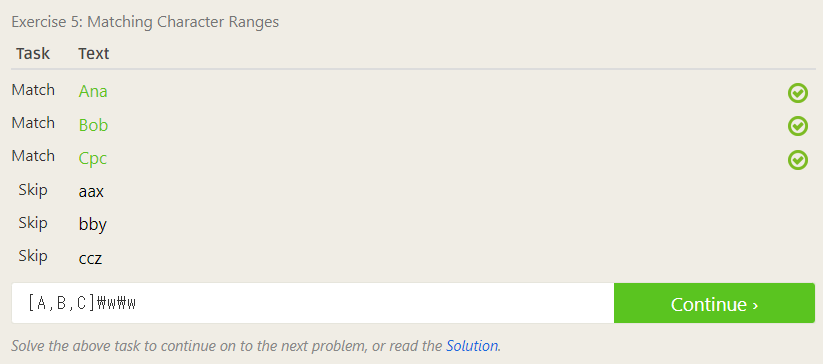 사이트에 처음 딱 들어가면 위와 같이 exercise 문제와 설명이 나와있고, 해당 문제가 어떤 표현식을 연습할 수 있는지 우측에 파란 글씨로 표시해준다.