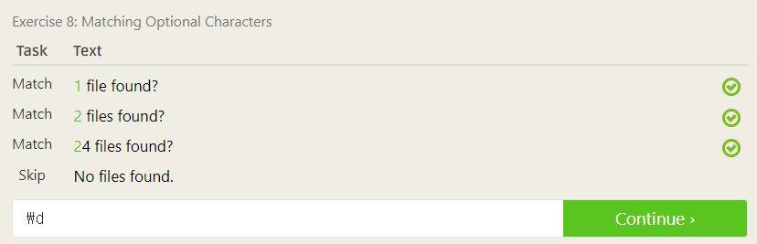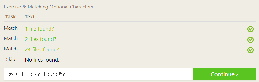 문제의 match 문자열들에서 file과 files가 혼용이 되어있는 것을 볼 수 있는데, 이 때 s를 적절히 처리하기 위해 바로 뒤에 물음표 문자를 입력해주어 optional로 처리해준다. 따라서 앞의 숫자와 뒤의 문자열을 더한 \d+ files? found\?를 입력해주면 통과된다.