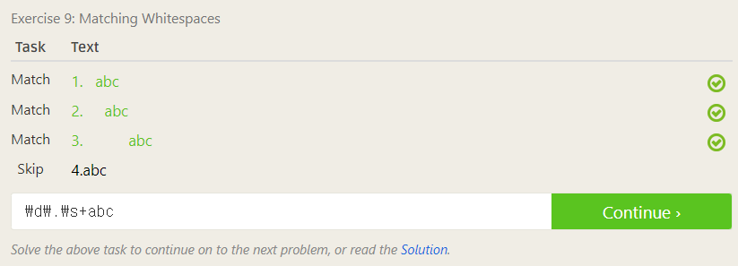 skip 문자열과의 차이점이 바로 이 공백이고, match 문자열들 간에 공백 문자 개수 차이가 존재하므로 \s+로 입력해주면 공백이 하나 이상인 문자열만 자동으로 통과될 것이다.
