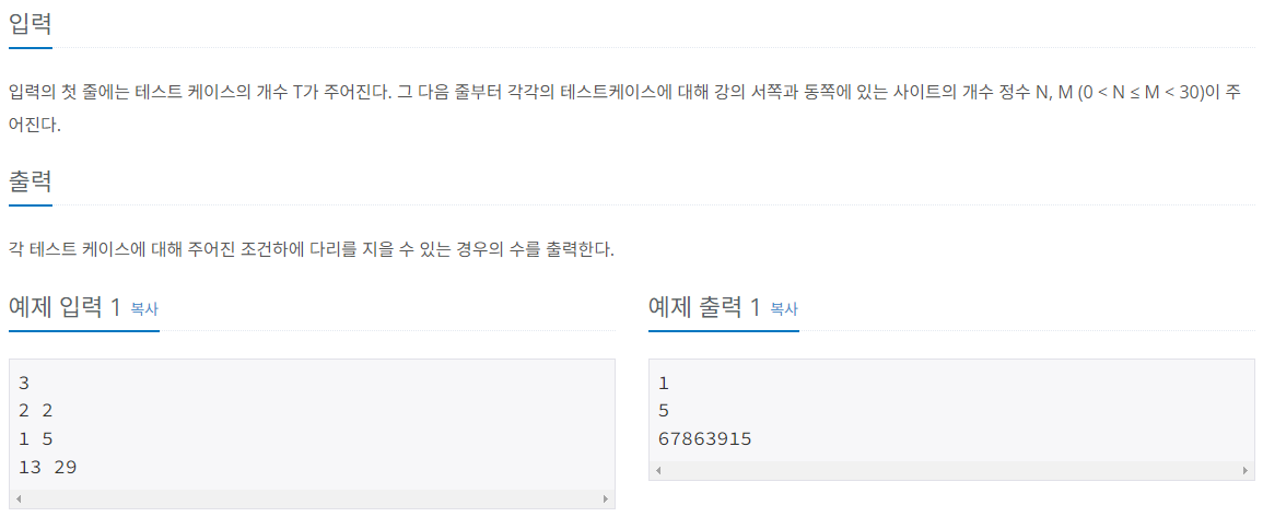 즉, 서쪽이 N개, 동쪽이 M개이고 M개 중에 N개를 연결시키는 것이므로 조합으로 따지면 mCn을 계산하면 되겠다.