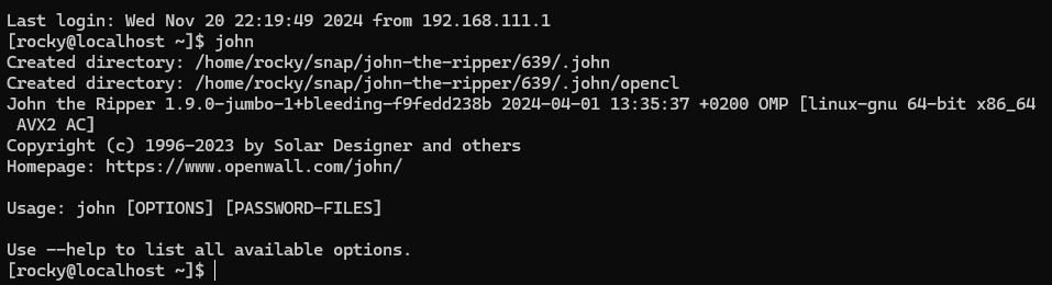 john-the-ripper가 제대로 설치된 것을 다음과 같이 쉘에 재로그인하여 확인할 수 있었다~