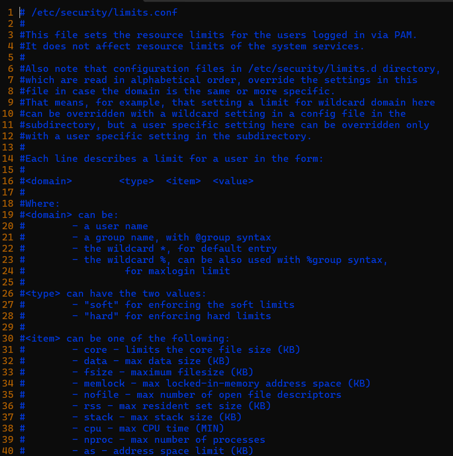 이를 영구적으로 변경하고 싶은 경우 다음과 같이 /etc/security/limits/conf 파일을 수정하면 된다!