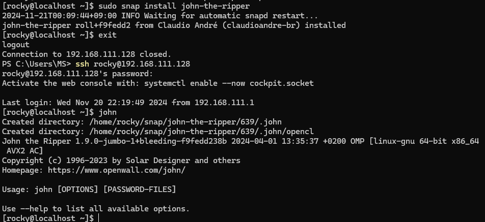 쉘에 재로그인 이후부터 john 명령어를 사용할 수 있음